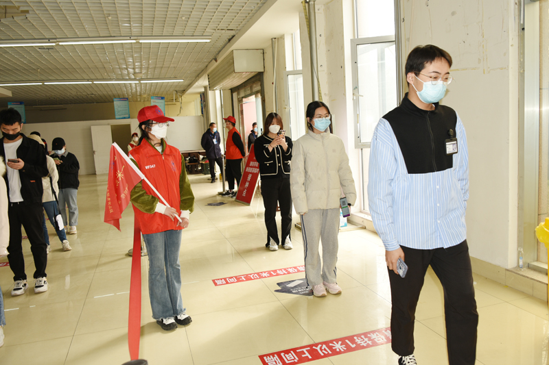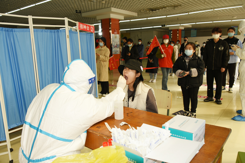 10点,在学校核酸检测点。根据疫情防控要求,学校对教职员工、学生进行第二轮核酸检测。在安保人员和学校团委组织的青年志愿者的引导下,参加核酸检测的人员按照要求,有序进行检测。