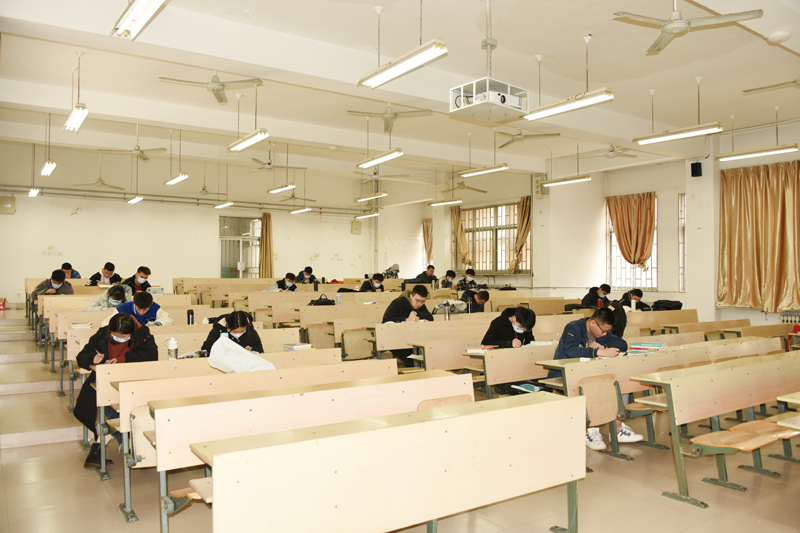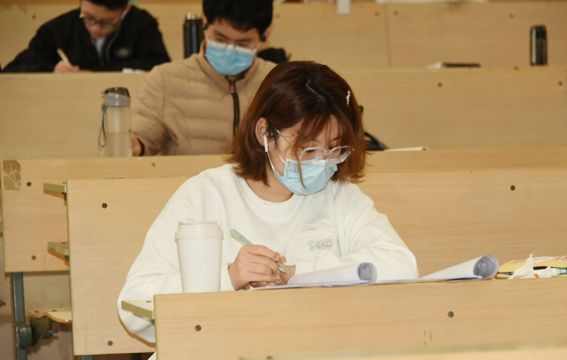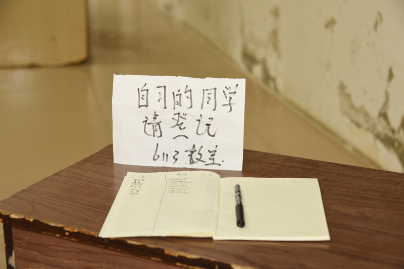 10点45分,学校6号教学楼的6113、6114教室。走进教室,只见门口摆放的课桌上,放着登记提示牌和登记簿,每一位走进教室的同学都认真作了登记,并且按照疫情防控要求,自觉拉开距离。他们都在认真自习,或奋笔疾书,或带着耳机听着网上辅导,整个教室内,鸦雀无声,一片浓厚的学习氛围。