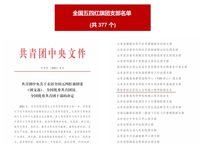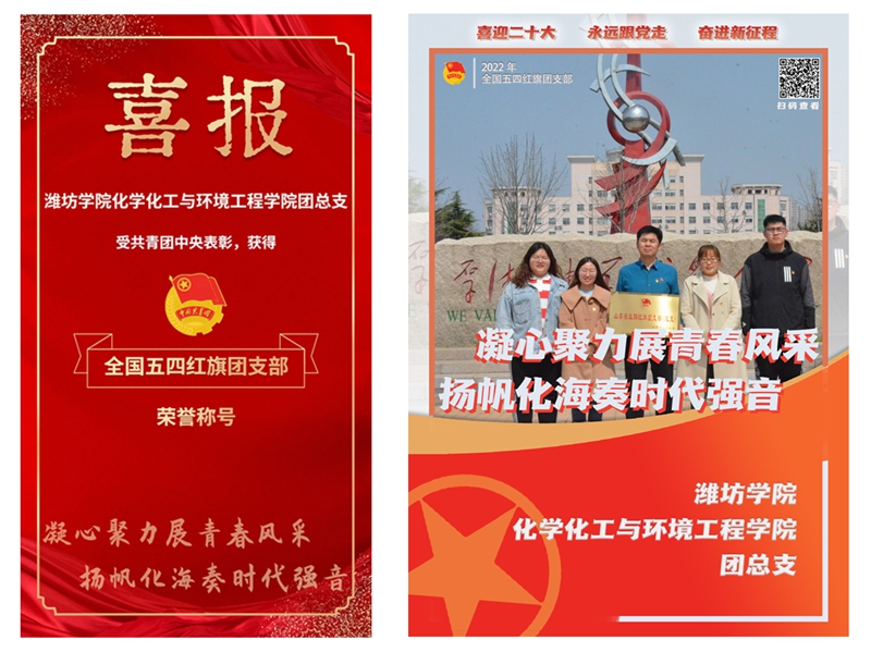 本网讯 2022年是中国共产主义青年团成立100周年。近日《共青团中央关于表彰全国五四红旗团委(团支部)、全国优秀共青团员、全国优秀共青团干部的决定》发布,我校化学化工与环境工程学院团总支榜上有名,获评全国五四红旗团支部,是山东省普通本科高校中唯一获此殊荣的基层团组织,这也是我校团组织首次入选全国“两红两优”。