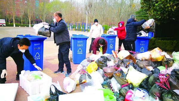 分工明确后,物业管理组的队员们不怕脏不怕累,扛起清理垃圾的重任,毫无怨言地无数次来回推送着重重的垃圾桶,加班加点直至深夜,只为第一时间打扫出干净卫生的环境。“队员们每天早晨5:00左右开始待命,在环卫车装卸垃圾桶时,他们需要把清空的六七十个垃圾桶排放整齐,以及打扫好垃圾房和垃圾站的卫生。为便于垃圾车能快速地装载,他们要在每天晚饭后把溢在地上的垃圾或装太满的垃圾桶整理一遍。”物业管理组的任怀坤副处长说道。其他组的队员们也会在工作之余协助物业管理组,一起为大家营造一个干净卫生的生活环境。