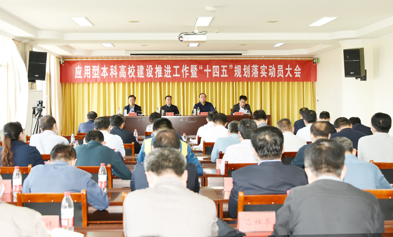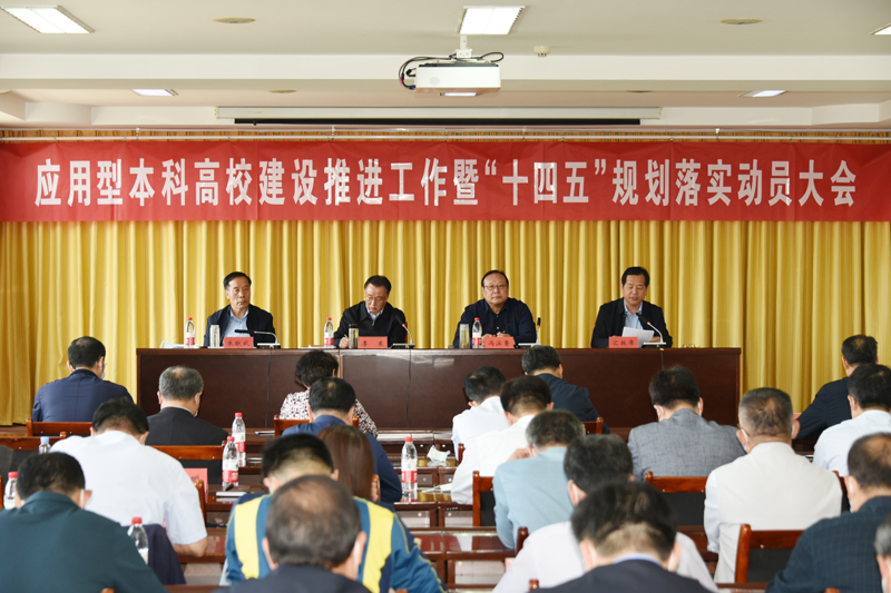 本网讯 5月3日下午,我校召开应用型本科高校建设推进工作暨“十四五”规划落实动员大会,梳理和总结“十四五”规划的落实和应用型本科高校建设的推进情况,部署下一步建设工作。会议由党委书记李东主持,校长冯滨鲁作动员讲话,副校长朱猷武作工作总结。学校党委副书记王清明,党委委员马茜华、赵光强、王旭升、王建新、李连成、单振涛出席会议。