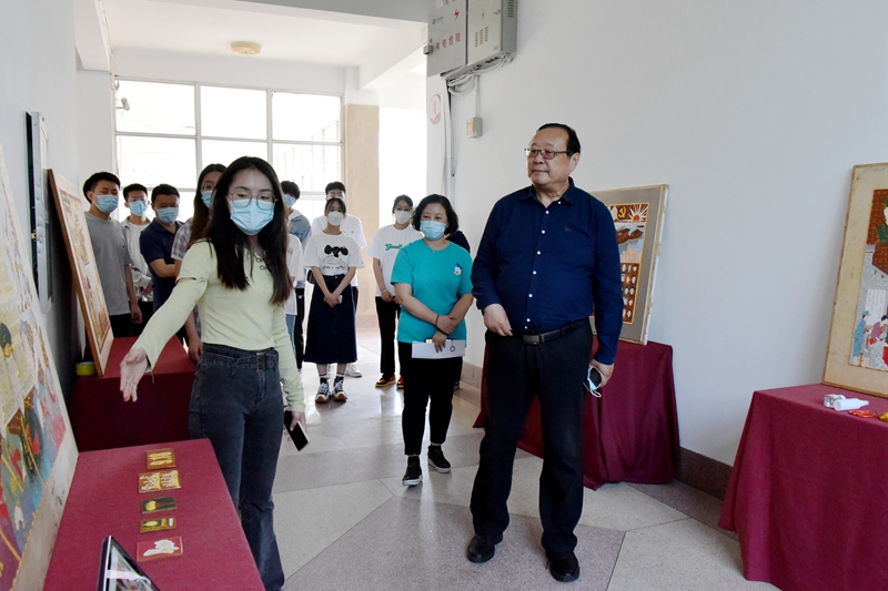 观展过程中,冯滨鲁在陈隶静老师指导学生创作的《五四运动》中国传统手工艺掐丝珐琅技法作品前,向在场的师生讲述中国共青团的建团历史,重温了共青团的光辉历程,引导激励团员青年奋发向上,在新时代追逐青春梦想。