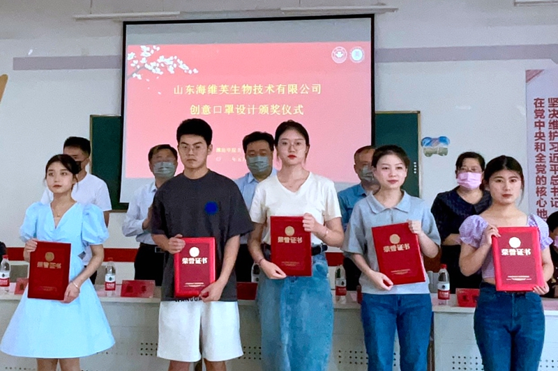 会上,董少军与美术学院院长王勇代表校企双方共同签订《潍坊学院就业实习基地建设及教科研合作协议》,并为就业实习基地揭牌,美术学院副院长陈隶静介绍了活动开展情况和下一步校企合作办学计划。合作发展处处长张华代表学校接收山东海维芙生物技术有限公司捐赠的创意口罩产品。嘉宾为前期参加公司举办的创意口罩设计活动的获奖学生颁奖。