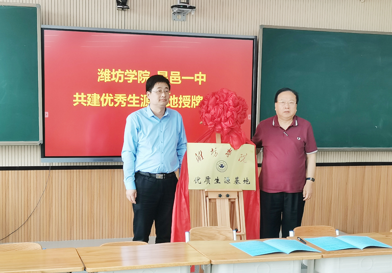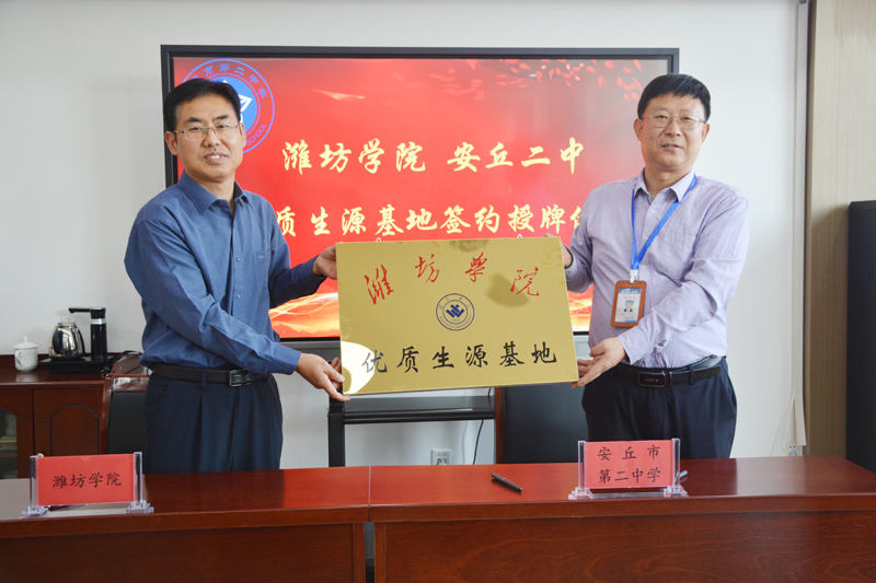 5月17日,我校与安丘市第一中学优秀生源基地签约仪式,在安丘一中举行。我校副校长朱猷武与安丘一中党委书记、校长张堂三共同为基地揭牌。仪式上,张堂三介绍了安丘一中的办学历史和成绩,强调了双方合作的重要意义。作为潍坊学院的校友,张堂三回顾了求学过程,表达了对潍坊学院的深厚感情,祝福母校越来越好。朱猷武高度评价了安丘一中取得的成就,介绍了潍坊学院近期的主要工作,提出了进一步拓宽合作的领域建议,并祝福安丘一中各项事业蒸蒸日上。教务处负责同志与安丘一中副校长王卫学签署优秀生源基地协议,朱猷武、张堂三共同为基地揭牌。双方围绕人才培养、师范专业认证、课题研究等合作领域进行了深入交流。