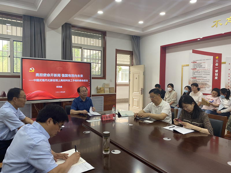 李英德以《勇担使命开新局 强国有我向未来——中国式现代化新征程上高校科技工作者的使命担当》为题,结合学习思考和工作实际,从“中国式现代化道路的提出及发展历程”“党的二十大报告关于中国式现代化的论述”“高校科技工作者在中国式现代化进程中的使命担当”三个方面,细致解读了党的二十大精神,重点诠释了高校以内涵式高质量发展肩负起服务国家现代化和教育现代化的双重使命。