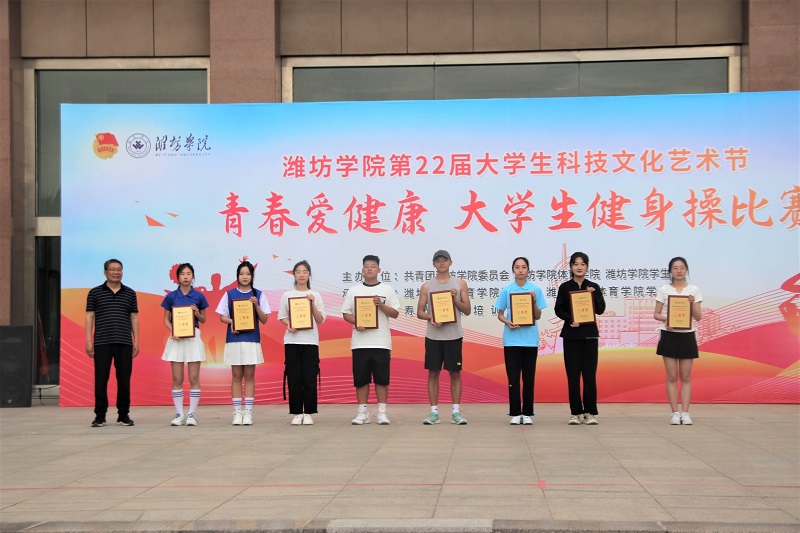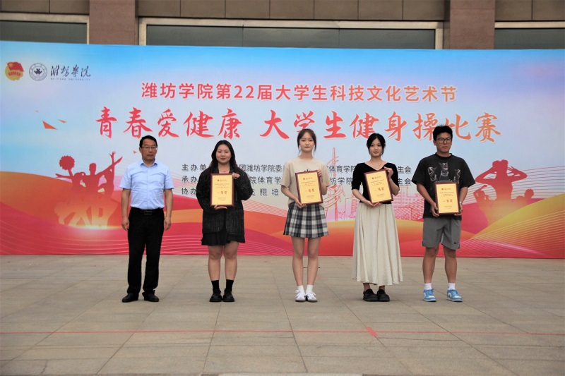 本网讯 6月3日,潍坊学院第22届大学生科技文化艺术节“青春爱健康”大学生健身操比赛在行政楼后广场举行。学校党委委员、宣传部部长单振涛出席。