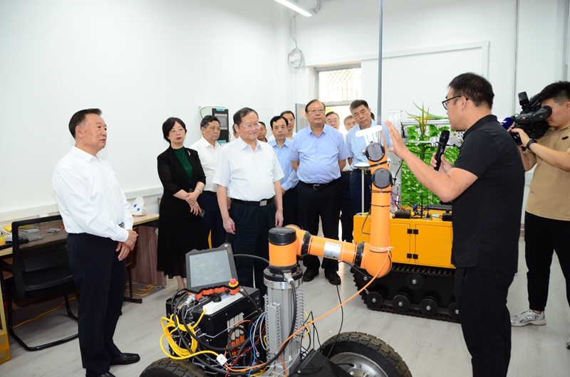李东会见考察组一行,介绍了学校事业发展情况。考察组首先进入科教产融合创新中心,参观了鲑鳟鱼设施健康养殖联合研发中心、磁悬浮低碳节能动力装备技术创新中心、山东柔识智能数字打印技术产业研究院、热数字孪生技术研发中心、智能装备与特种机器人技术创新中心、器视觉感知与控制技术创新中心等。之后前往智能制造工程实训中心,考察了动力装备拆装实训区、数字化学习空间、“大国工匠”工作室、机器人基础教学实训区、机器人创新实践区、机器人行业应用实训区、智能制造实践实训区等。