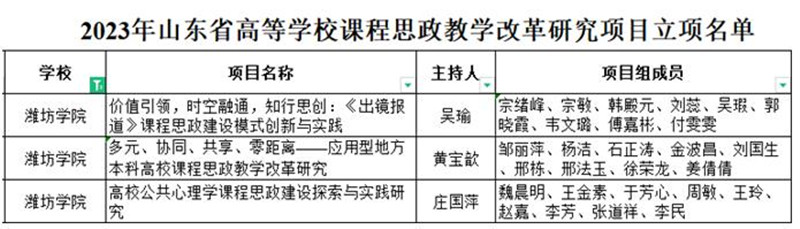 本网讯 近日,山东省高等学校课程思政中心公布了2023年山东省高等学校课程思政教学改革研究项目立项名单,我校教师教育学院(特教幼教师范学院)庄国萍教授团队的《高校公共心理学课程思政建设探索与实践研究》、物理与电子信息学院黄宝歆教授团队的《多元、协同、共享、零距离——应用型地方本科高校课程思政教学改革研究》、传媒学院吴瑜副教授团队的《价值引领,时空融通,知行思创:<出镜报道>课程思政建设模式创新与实践》全部获批,立项数量位居全省同类高校前列。