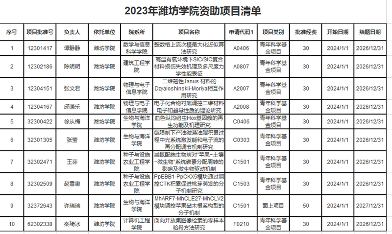 其中,数学与信息科学学院谭静静老师获批青年项目1项;物理与电子信息学院邱潇乐老师、张文君老师获批青年项目2项;生物与海洋学院许瑞瑞老师获批面上项目1项,徐从梅老师、张莹老师获批青年项目2项;种子与设施农业工程学院王芬老师、赵雪惠老师获批青年项目2项;计算机工程学院秦琦冰老师获批青年项目1项;建筑工程学院陈明明老师获批青年项目1项。