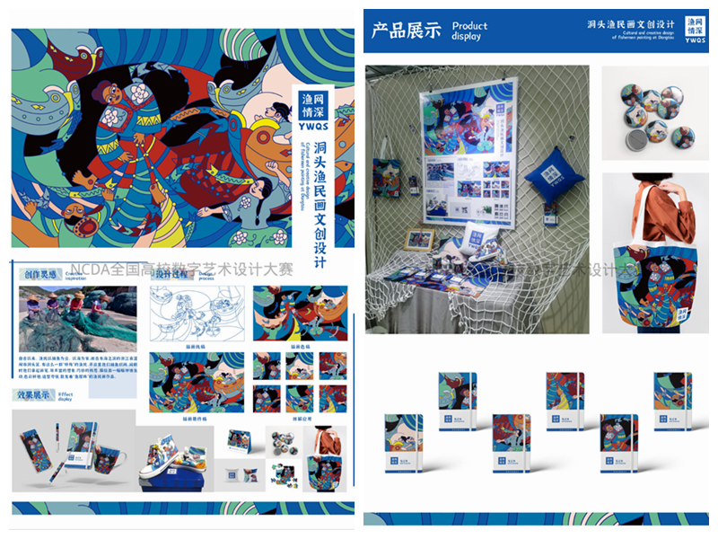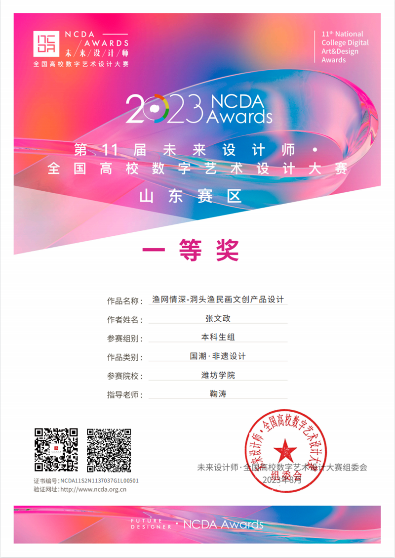 美术学院视觉传达设计专业张文政同学的作品“渔网情深-洞头渔民画文创产品设计”获得国赛一等奖,鞠涛老师获得优秀指导教师,唐乃行老师获得优秀组织教师,潍坊学院获得优秀组织奖。