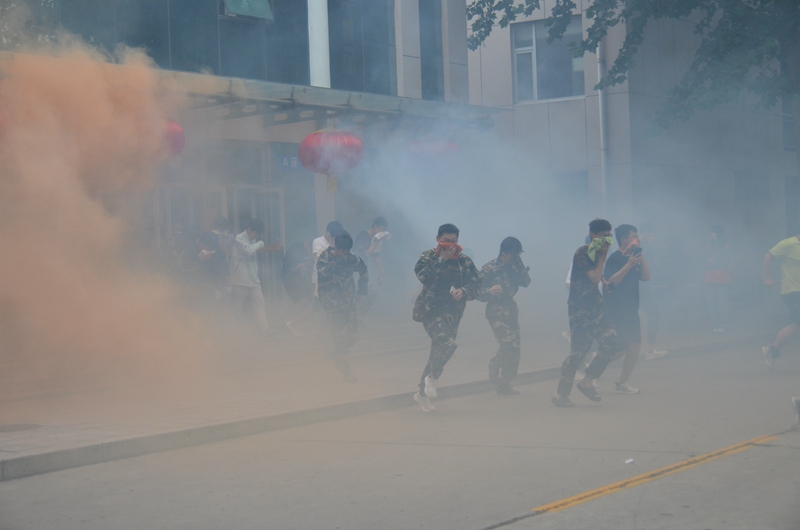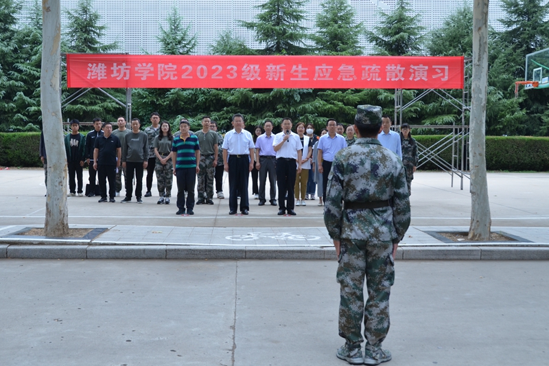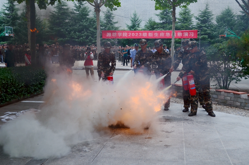 15时30分,演习各项工作准备就绪,现场指挥员报告后,演习总指挥命令:“潍坊学院2023级新生消防逃生演习开始!”消防值班室值班员立即开启应急疏散警报,学生公寓值班员按照应急疏散预案的要求,切断应急门的主电源,开启全部疏散通道,指挥被困学生用湿毛巾捂住口鼻分别从安全出口和一楼的“应急窗”有序疏散,并同时向校保卫处和“119”报警。学校保卫处工作人员接到报警后,携带灭火器,迅速赶赴火场救援。“119”指挥员到达现场了解情况后,立即组成战斗小组,并对消防战斗员下达灭火命令,被困学生在工作人员组织的自救和消防队员的帮助下,全部疏散到楼外的安全地带。随后,2023级新生进行了灭火实战汇报表演。