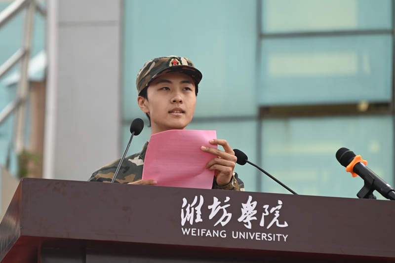 计算机工程学院网络工程专业代得钰同学作为新生代表发言。他表示,在新起点他们将铭记教官们的言传身教,在今后的学习和生活中,严格要求自己,以实现人生的自我价值。他向潍院学子们发出倡议:树立远大理想,提升全面成才的高度;加强理论学习,增加专业本领的厚度;提高实践本领,拓展综合能力的广度。