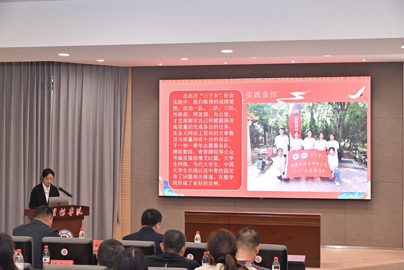 活动开始前,播放了《知行合一青春绽放——2023年“三下乡”风采展》视频,回顾我校暑期“三下乡”社会实践活动情况。各学院实践服务队代表先后通过PPT、视频等形式,依次从活动筹备、活动开展、成果展示、宣传报道等方面汇报了暑期社会实践的开展情况,分享了实践过程中的经验做法以及心得感悟,展现了我校青年学子躬身实践、力学笃行的青年担当。