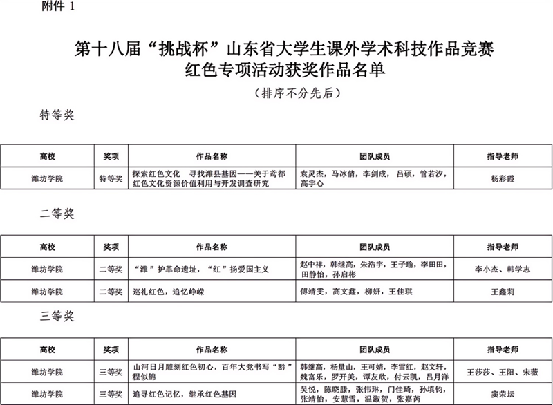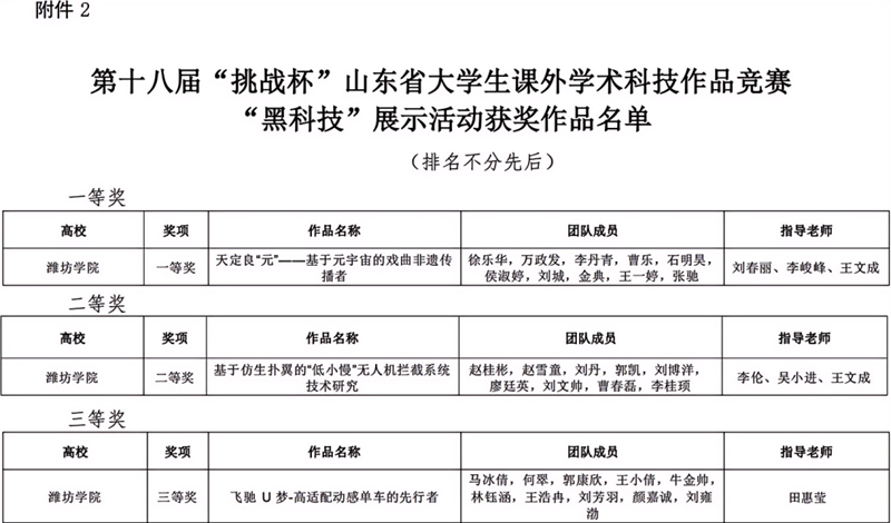 本网讯 近日,“挑战杯”山东省大学生课外学术科技作品竞赛组织委员会公布《第十八届“挑战杯”山东省大学生课外学术科技作品竞赛红色专项和“黑科技”展示活动获奖作品名单》,我校获红色专项特等奖1项、二等奖2项、三等奖2项;“黑科技”一等奖1项、二等奖1项、三等奖1项,实现获奖数量新突破。