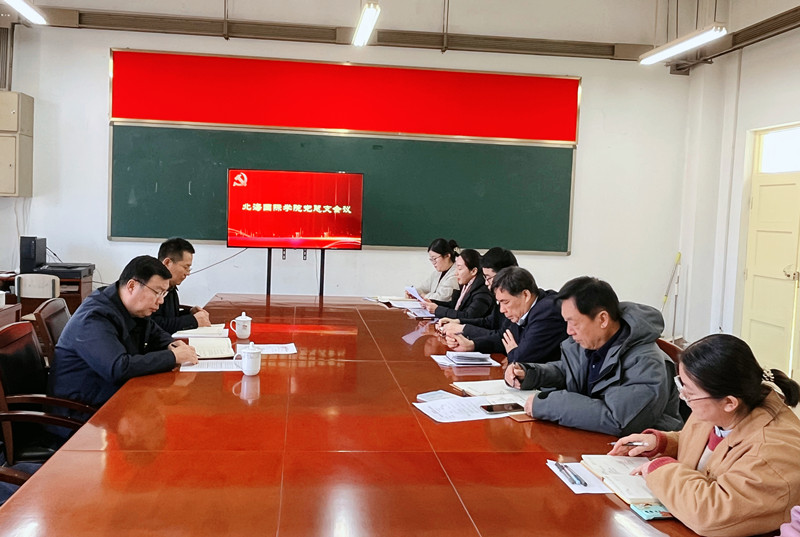北海国际学院党总支会议传达学习了近期学校有关会议及通知文件精神,研究了国际学生招生管理、班主任配备等相关议题。王成端进行了点评。他表示,本次会议领导班子重视,第一议题学习制度完善,议事决策职责边界清晰,决策原则和程序规范。他要求,要强化政治站位,充分认识党总支会议的地位作用。全面落实学校第四次党员代表大会重点工作任务,落实有关“稳步提升国际学生招生数量和质量”的工作要求,加强与有关部门沟通合作,加大本科招生数量;要进一步加强队伍建设,要在精通国际业务方面多下功夫,以上级文件为依据,慎重出台有关国际学生管理规定;要坚持党建与业务深度融合,推动学院高质量发展,凝练北海国际学院国际化办学特色,超前谋划做好各项工作。