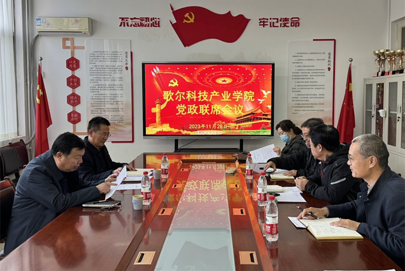 歌尔科技产业学院党政联席会议研究了产业教育教学学科、专业研究平台及方向,与相关企业合作推进措施,人才引进及“新能源工程技术创新团队”建设、班主任聘任等相关工作。王成端对本次会议进行了点评。他认为,本次会议主题突出鲜明、议事职责边界清晰、决策原则程序规范、会前准备充分、落实措施务实,是一次高质量的党政联席会。他要求,要进一步加强学科建设,突出产教融合特色,学院与企业合作措施要落实到位。