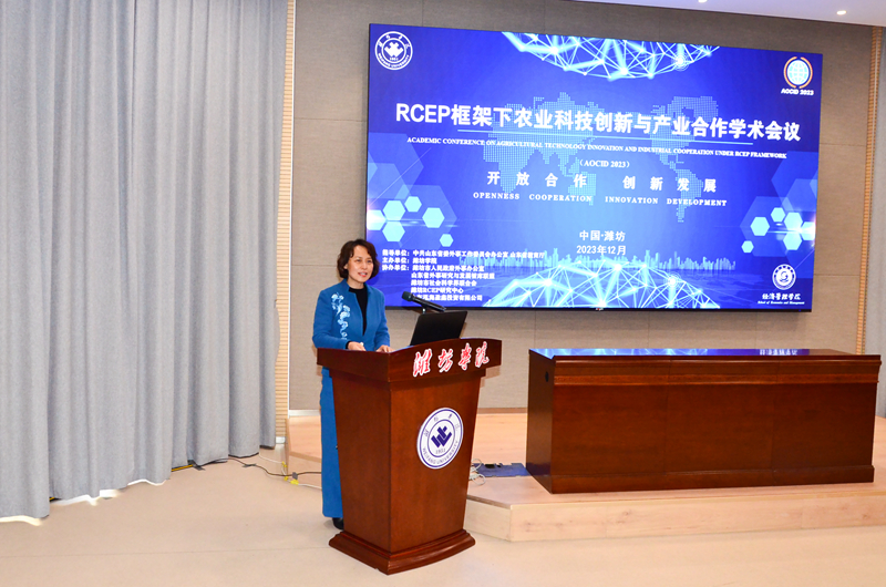 徐梅在致辞中向各位专家学者的到来表示热烈欢迎,她指出,学校秉持开放式、国际化办学理念,与潍坊市人民政府外事办公室共同发起成立“潍坊RCEP研究中心”,通过发挥学校人才、科技、学科等优势力量,推动地方与RCEP成员国在经贸、文化、教育、新兴产业等领域深度合作、优势互补、优化升级,助力打造面向日韩、联通欧亚、融入“一带一路”的国家纵深开放北方战略支点城市中心。大会的召开,必将对促进我校农业、经济类专业融合发展,推动与国内外高校学术资源共享,进一步提升学校国际化办学水平产生深远影响。
