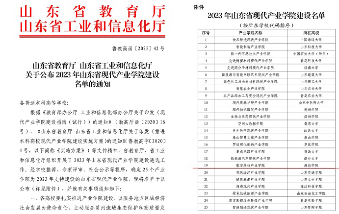 本网讯 近日,山东省教育厅、山东省工业和信息化厅公布了2023年山东省现代产业学院建设名单,我校歌尔科技产业学院榜上有名。这是我校继潍柴产业学院获批山东省首批现代产业学院、天瑞磁悬浮产业学院获批工信部“专精特新”产业学院之后的又一重要收获。