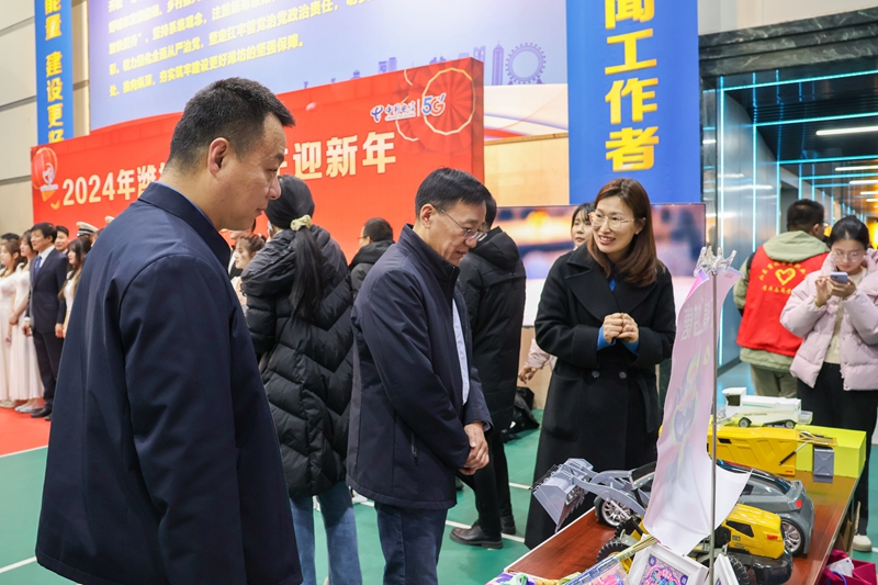 演出前,来逢波到高校办学特色展示现场指导我校布展工作。我校设置了“写好‘四融文章’,开创国内一流应用型大学建设新局面”的宣传展板,在展台上以实物形式展示工业设计专业学生的设计作品和美术专业学生的文化创意作品。来逢波仔细听取师生讲解,对同学们在作品创作中的艺术表现、创意思维和实践能力给予高度赞扬,对学校布展工作给予充分肯定。