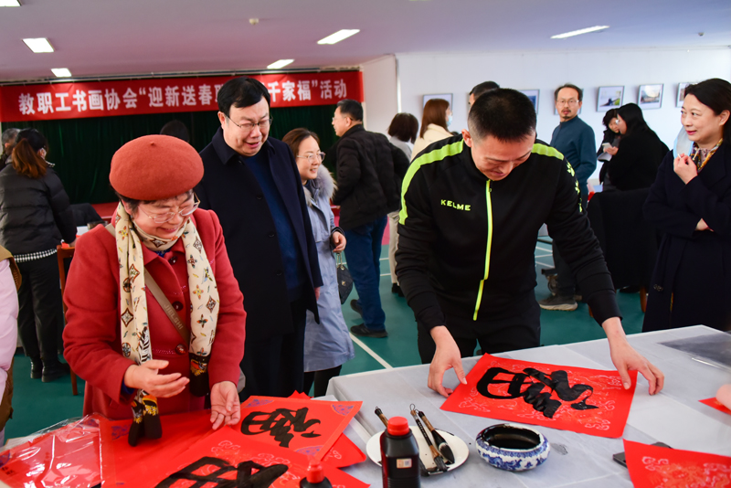 本网讯 1月12日下午,学校教职工书画协会在行政楼8楼教职工之家举办了2024年“迎新送春联,献瑞千家福”送万福进万家书法公益活动,学校党委委员、副校长王成端参加活动。