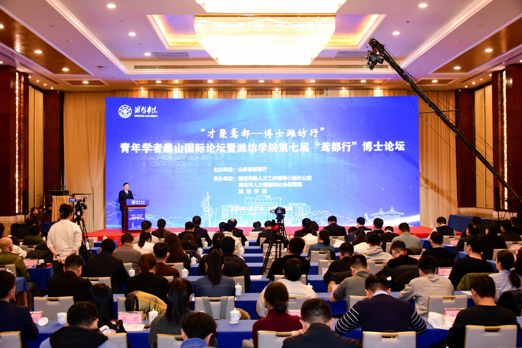 本网讯 1月27日,“才聚鸢都——博士潍坊行”青年学者泰山国际论坛暨潍坊学院第七届“鸢都行”博士论坛在潍坊富华国际会议中心开幕。山东省教育厅总督学王浩,潍坊市副市长陈端梅,市委组织部副部长、市人社局局长刘太福,学校党委书记徐梅致辞。学校党委副书记王守全,党委委员李英德、苗金春、任立春、赵加强、张晓静出席。开幕式由学校党委副书记、校长来逢波主持。