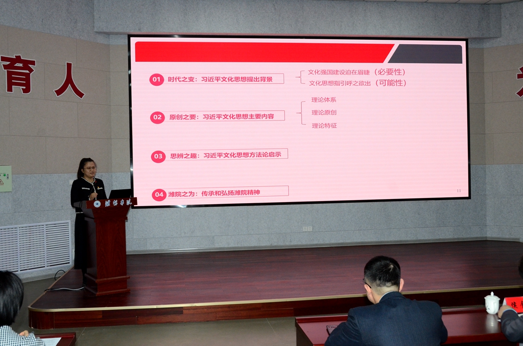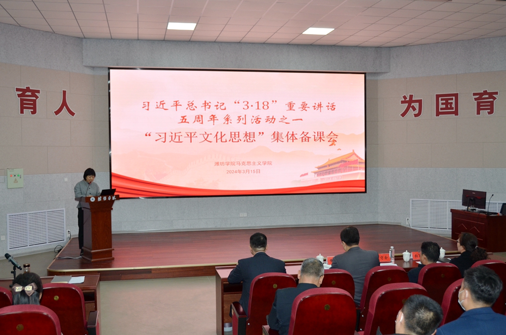 活动中,马克思主义学院四名教师分别从习近平文化思想的提出背景、主要内容、方法论启示和潍院之为四个方面进行了集体备课说课展示,围绕知识体系搭建、内容设计、重难点阐释等问题对如何讲好习近平文化思想作了系统梳理。