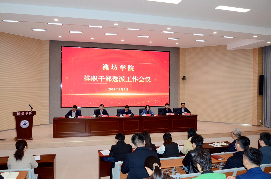 本网讯 4月3日,潍坊学院挂职干部选派工作会议在知新楼4109报告厅举行。潍坊市委组织部副部长、市委老干部局局长,市人才发展服务中心主任,市公务员局局长刘学刚,学校党委书记徐梅出席会议并讲话,党委副书记、校长来逢波主持会议。党委副书记王守全,党委委员、组织部部长赵加强出席会议。
