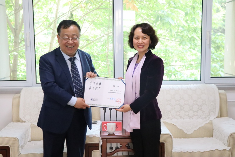 徐梅代表学校对罗林一行来访表示欢迎。她简要介绍学校的发展历程、师生规模、科研优势以及外事智库取得的成绩,希望罗林教授一如既往地支持学校国别区域研究工作以及智库平台的建设发展。徐梅为罗林等教授颁发客座教授聘书。