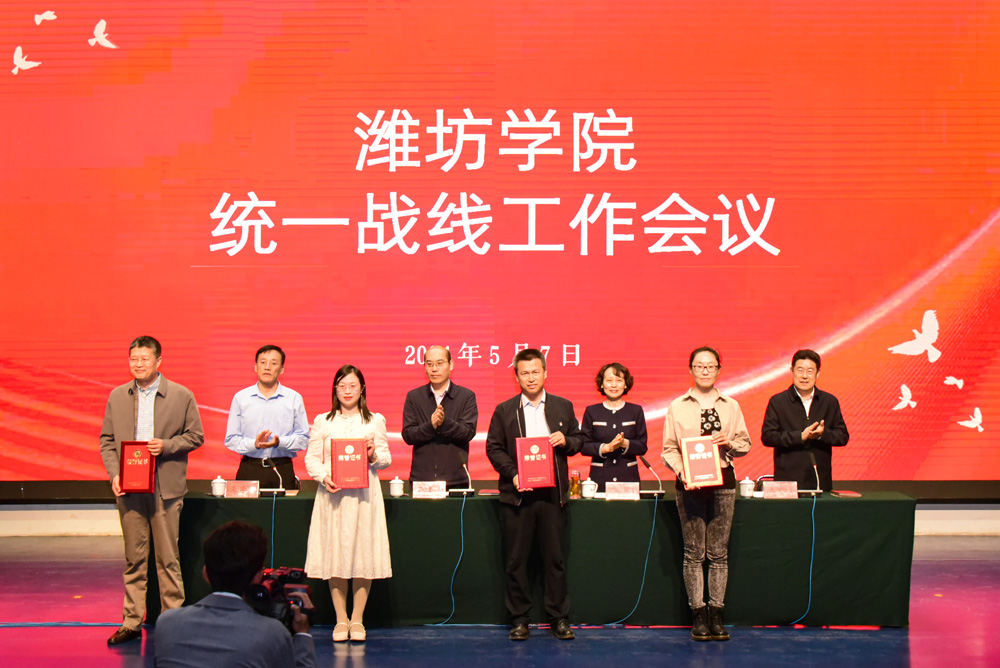 会议对2023年统一战线(工作)先进集体先进个人进行了表彰。丁建营、王守全共同为潍坊市党外知识分子“爱国奋斗·建功立业”实践基地揭牌。