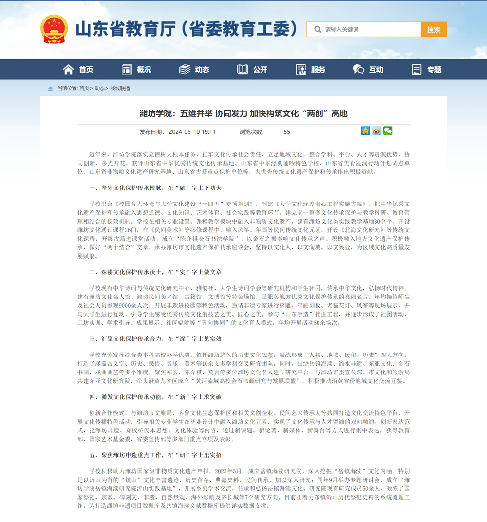 【山东省教育厅】潍坊学院:五维并举 协同发力 加快构筑文化“两创”高地