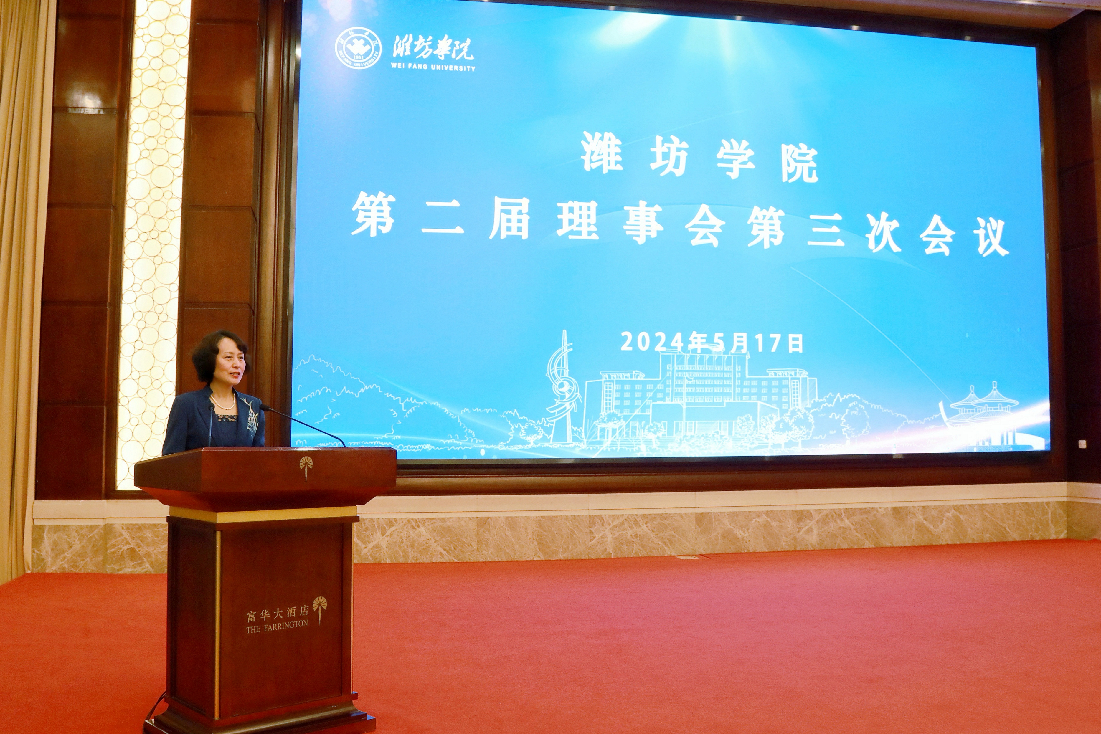 本网讯    5月17日下午,潍坊学院第二届理事会第三次会议召开。学校党委书记、第二届理事会理事长徐梅出席会议并作工作报告,党委副书记王守全主持会议,党委领导班子成员王成端、李英德、苗金春、赵卫红、任立春、赵加强、张晓静出席会议,潍坊学院原党委书记辛丕宏、李东,潍坊学院原党委副书记、校长冯滨鲁,第二届理事会副理事长单位代表、潍坊16个县市区与开发区作为首次理事成员出席会议。