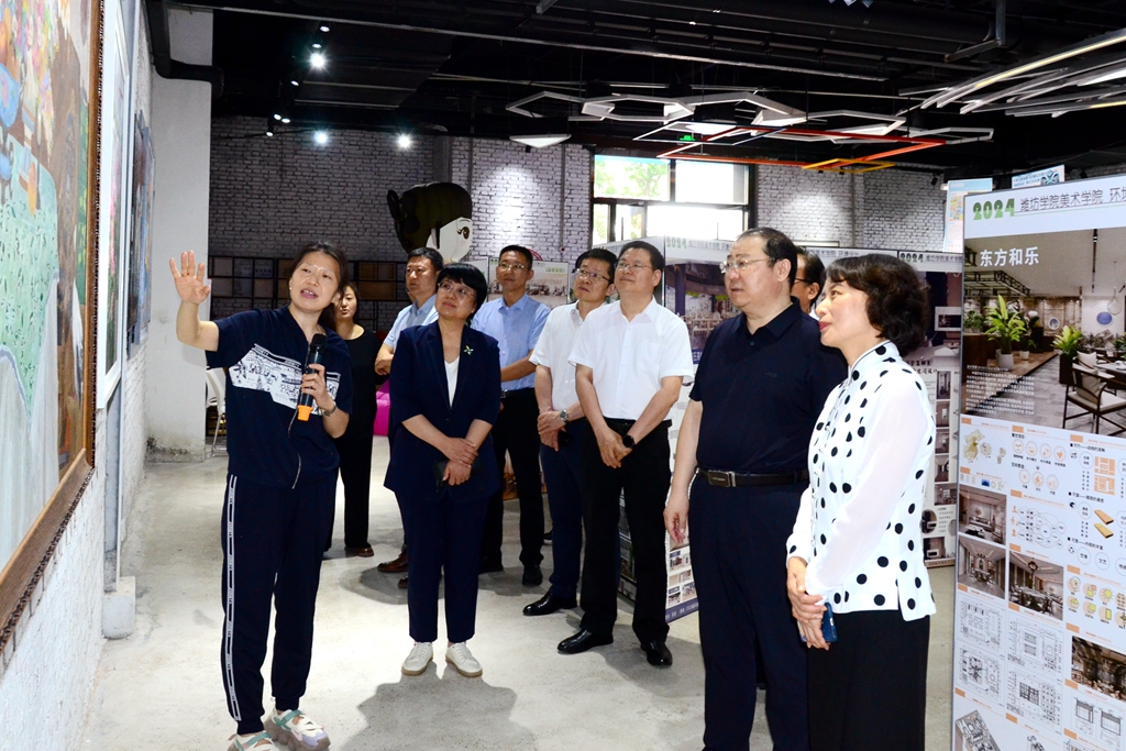 本网讯 5月30日,学校党委书记徐梅,副校长赵卫红、任立春,奎文区委副书记、区长刘建安到潍坊1532文化产业园参观美术学院2024届毕业作品展。