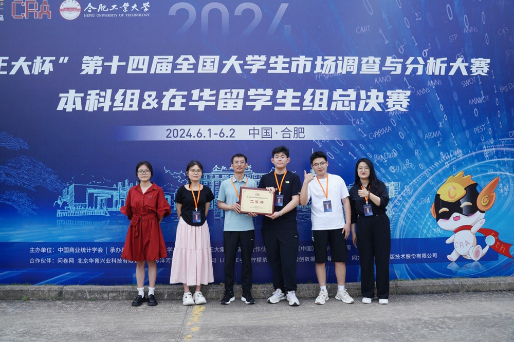 全国大学生市场调查与分析大赛,由中国商业统计学会主办,是《全国普通高校学科竞赛榜单》中的高水平全国性大赛之一。本次比赛,于2023年9月启动,本科生组共有来自全国901所高校、23.3万名学生报名参赛。我校选拔组建4支代表队参赛,历经7个月,经过理论知识赛、初赛、企业命题赛、省赛和国赛的层层选拔、比赛,最终在全国总决赛中,巩家瑞、孙笑容、亓荣凤、周悦、范伟鹏5名同学组成的代表队荣获本科生组全国二等奖,郑惠敏、田博月、王小倩、刘芳羽、宋仪佳5名同学组成的代表队荣获全国三等奖;另外两支代表队分别获得山东省赛区一等奖、三等奖。