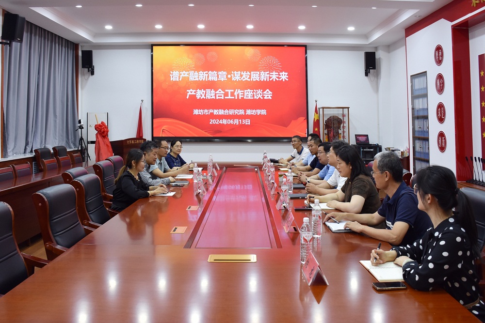 本网讯 6月13日,潍坊市产教融合研究院潍坊学院分院揭牌仪式在我校举行。副校长王成端,潍坊市产教融合研究院院长田元训出席仪式。双方围绕产教融合、校企合作和产业学院建设等工作,以“谱产融新篇章·谋发展新未来”为主题进行座谈。