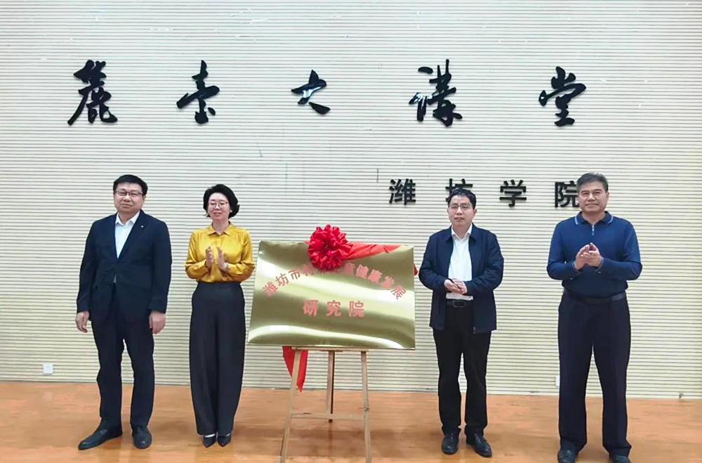 苗金春与潍坊市残疾人联合会党组书记、理事长王妍妮,潍坊市教育局党组成员、副局长宋炳华,潍坊市卫生健康委员会计划生育协会二级调研员张新军为研究院揭牌。