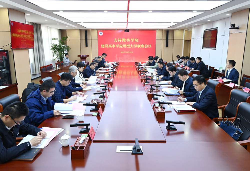 本网讯 10月31日,潍坊市委、市政府支持潍坊学院建设高水平应用型大学第三次联席会议在校召开,专题研究校企合作相关事宜。潍坊市副市长马勇出席会议并讲话,校党委书记来逢波主持会议。市政府副秘书长王继东,市教育局局长、市委教育工委常务副书记王霞,市科技局、市工信局、市人社局分管负责同志,潍柴控股集团有限公司、歌尔股份有限公司、豪迈集团股份有限公司、潍柴雷沃智慧农业科技股份有限公司、山东港口渤海湾港口集团等驻潍企业相关负责人,校党委班子成员参加会议。