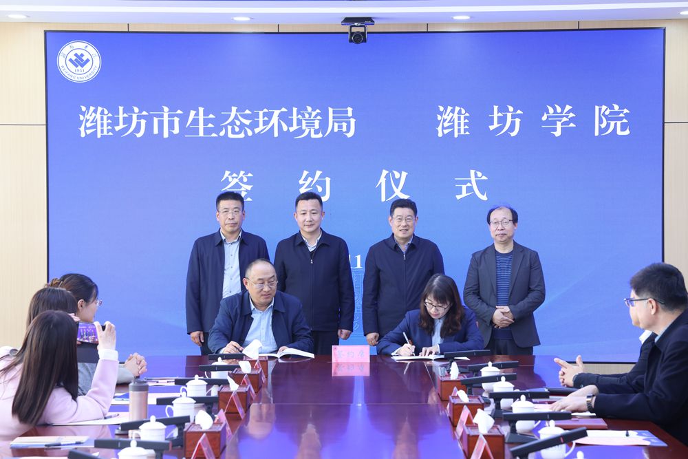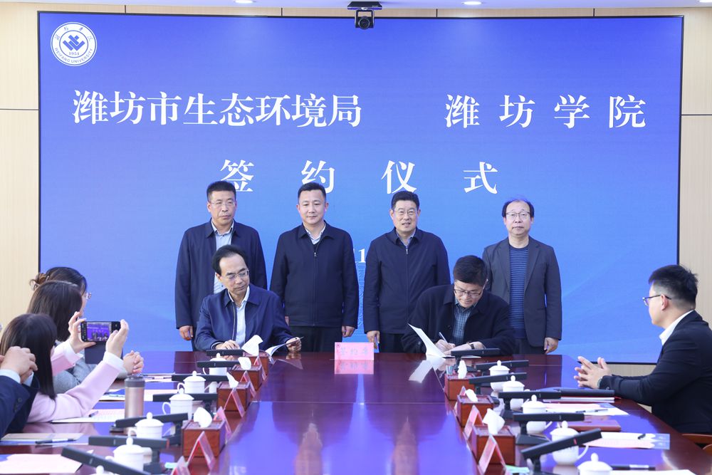 本网讯 11月13日,学校与潍坊市生态环境局合作签约仪式在校举行。学校党委副书记王守全致辞,学校党委委员、副校长李英德,潍坊市生态环境局党组书记、局长邹晓东,潍坊市生态环境局党组副书记、副局长孟建明出席活动。