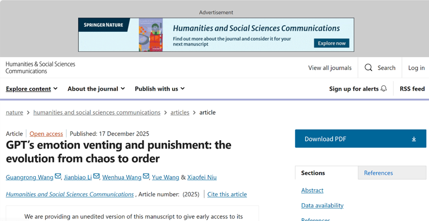 本网讯 近日,我校经济管理学院王光荣教授团队研究成果“GPT’s emotion venting and punishment: the evolution from chaos to order”在Humanities & Social Sciences Communications(HSSC)上发表,标志着我校在人工智能与行为科学交叉领域的创新研究取得了重要突破。该成果由我校王光荣教授、南开大学李建标教授、山东大学王文华博士后、王粤博士和牛晓飞教授合作完成。