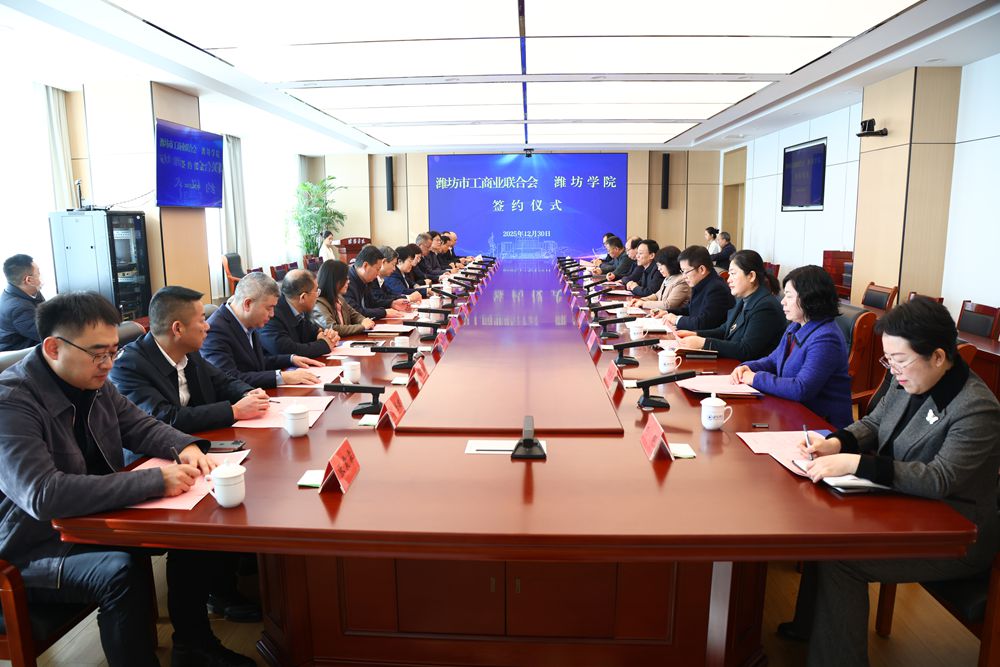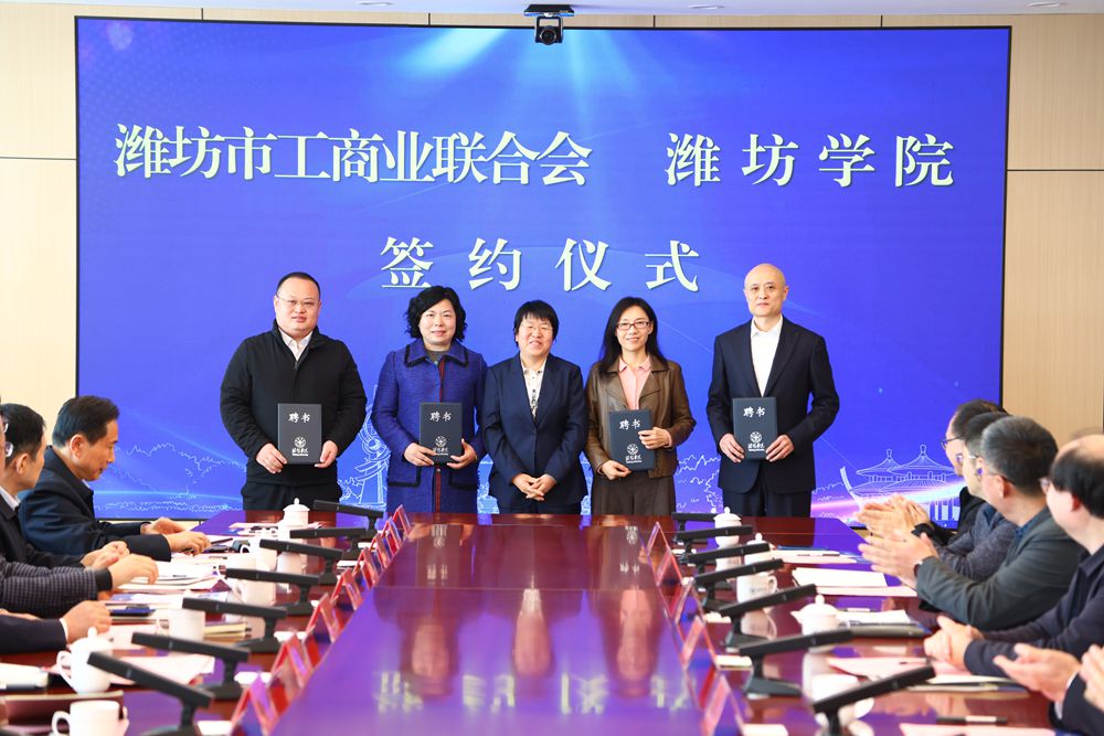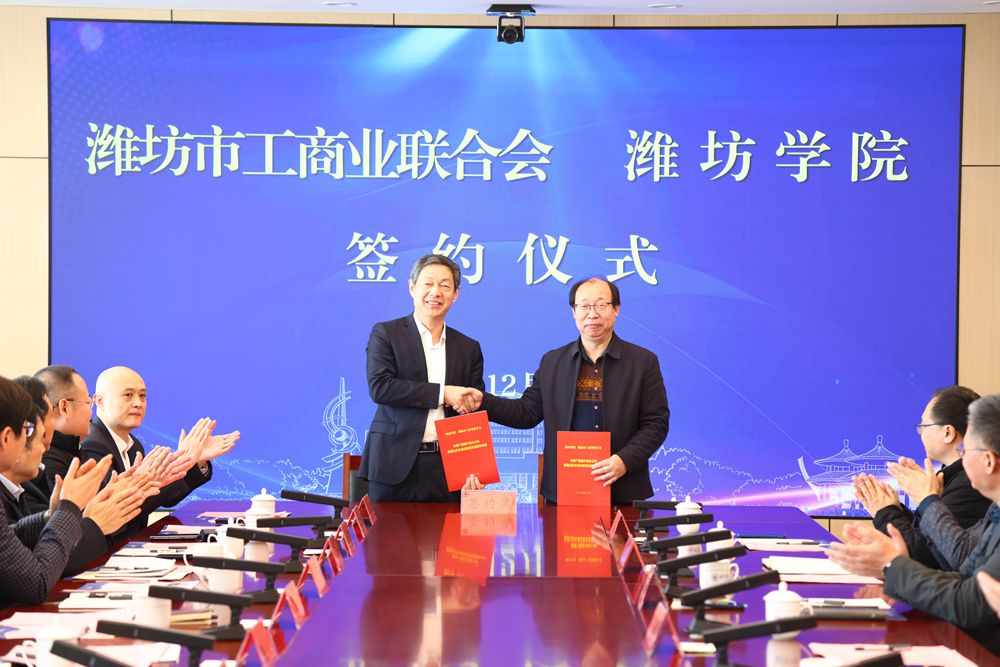 本网讯   12月30日,学校与潍坊市工商业联合会(以下简称“市工商联”)举行全面合作框架协议签约仪式。潍坊市人民政府副市长、市工商联主席陈端梅,学校党委书记来逢波出席活动并致辞。学校党委副书记、校长王霞主持活动。潍坊市人民政府办公室副主任赵昌丽,潍坊市委统战部副部长、市工商联党组书记、常务副主席刘兴成,学校党委委员、副校长李英德出席活动。