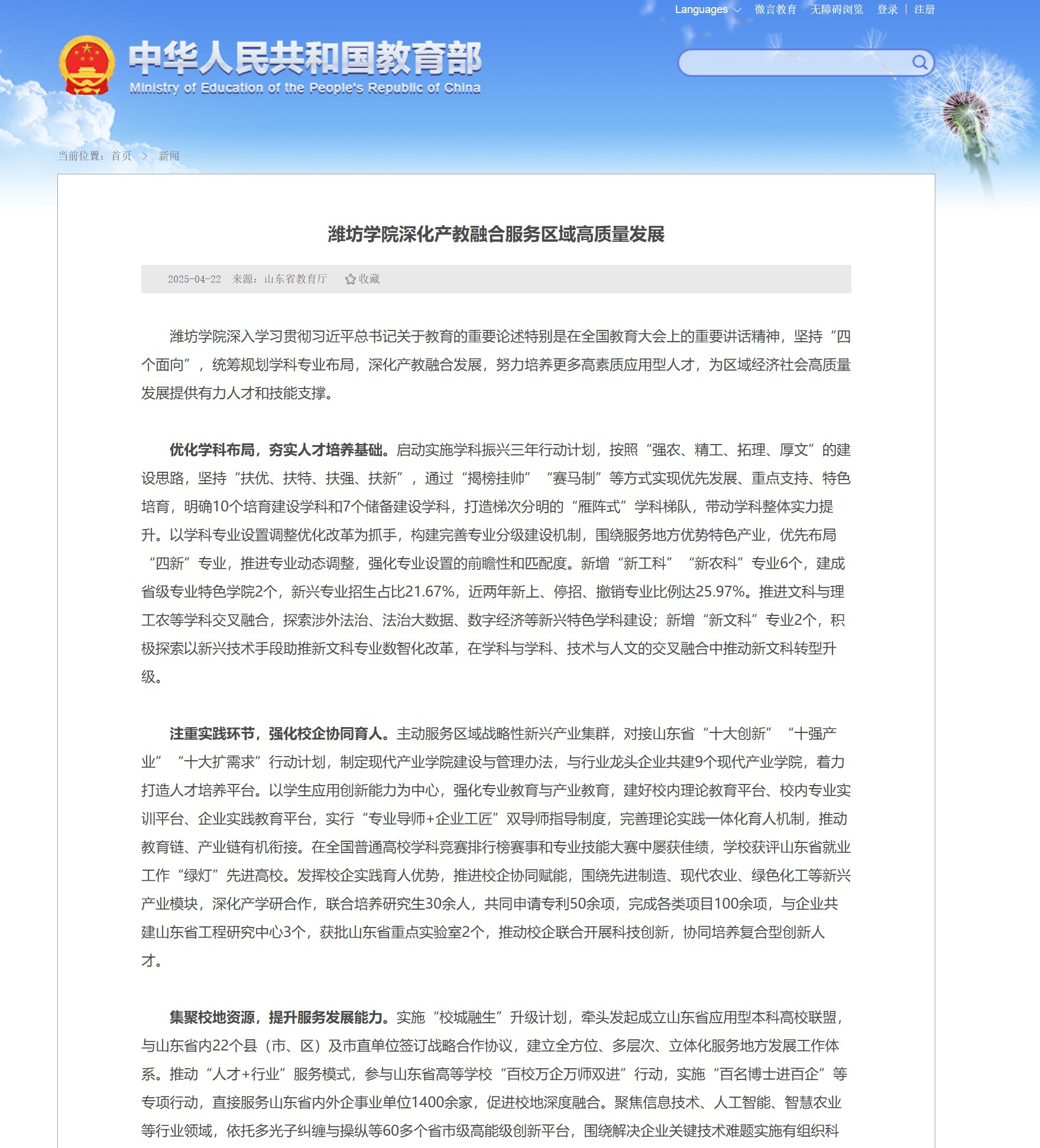 8月25日,潍坊市委、市政府支持潍坊学院建设高水平应用型大学第一次联席会议在学校召开,标志着校地常态化、制度化协作迈入新阶段。